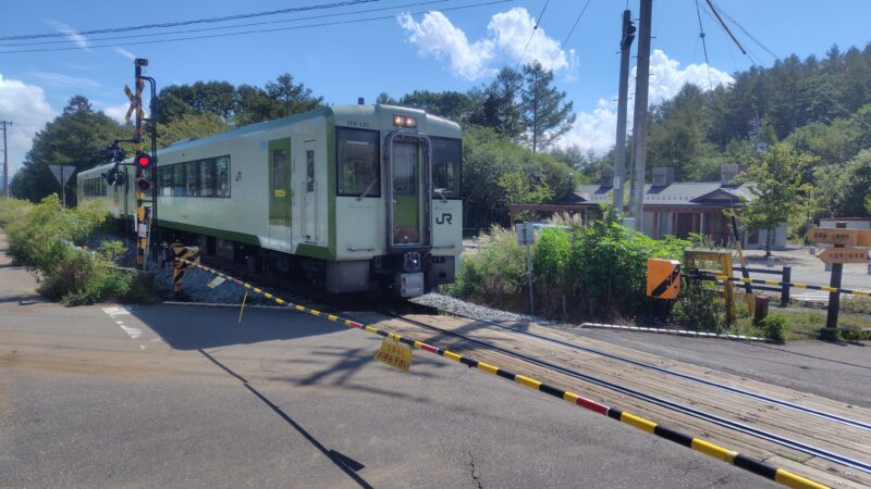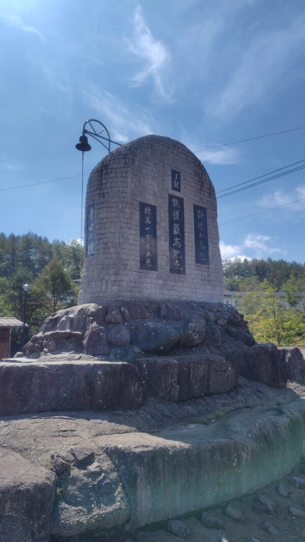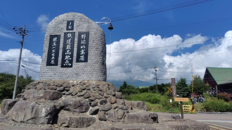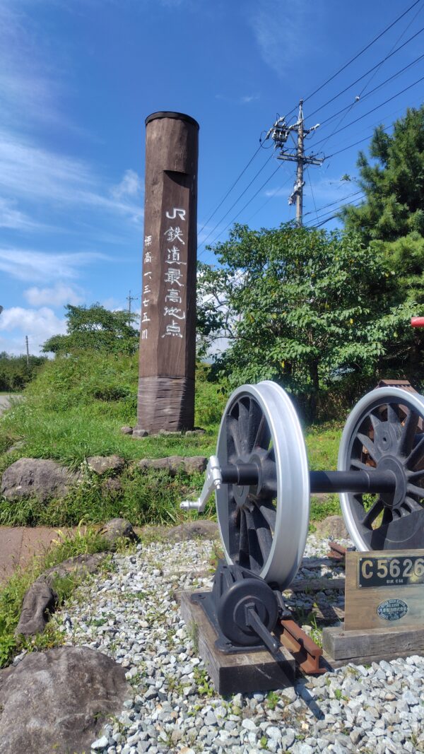 JR鉄道最高地点に到達して通過していく電車という瞬間に偶然遭遇できた。国道の最高地点が2000mオーバー(渋峠)なのに対してこのJR鉄道最高地点は1345mなので高原には違いないが、酷暑が続いて晴れ間の中ではじりじり暑くなってきており、少なくとも涼しくはなくなってきた。