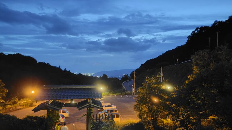 湯上りに出てみると暗くなるのが早くなってきていて季節は確実に進んでいる事を実感。山梨の夜景もわずかに見える。